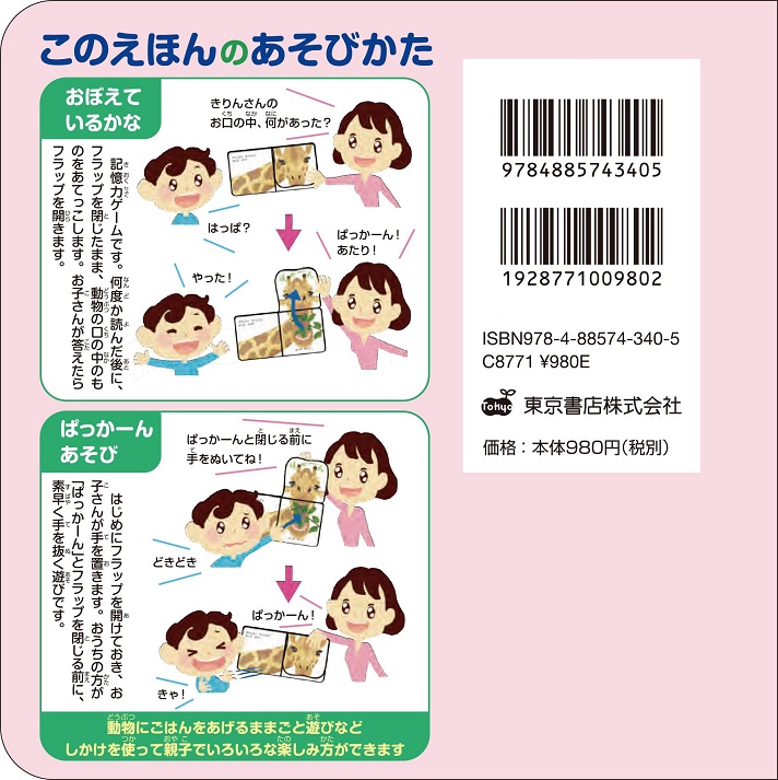 しかけえほん「どうぶつ ぱっかーん」(東京書店)のイラストを担当しました。親子で楽しめる知育しかけ絵本です。数多くの知育絵本を手がけられた幼児教育研究家の わだことみ先生とご一緒させて頂きました。